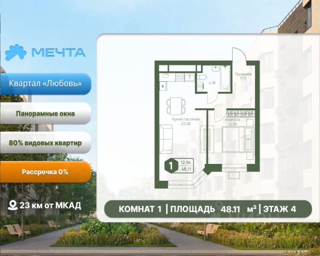 Рассрочка 0% от застройщика! Продается однокомнатная квартира в квартале "Любовь" жилого комплекса "Мечта". Общая площадь квартиры: 33.53 кв. м, этаж 5 из 5. Срок сдачи: 4 квартал 2027 г. Отделка: Чернова ОСОБЕННОСТИ: - Просторная кухня-гостиная - Продуманная планировка - Широкоформатные окна - Высота потолка: 2.7 метра Квартал "Любовь" — это пять пятиэтажных домов, где продумано действительно всё. Здесь каждая квартира получает больше воздуха и света благодаря панорамным окнам и эркерам. А лифты в малоэтажном доме — большая редкость для Подмосковья, которая делает жизнь комфортнее с первого и до последнего этажа. Просторные мастер-спальни и продуманные планировки — визитная карточка квартала. А из 80% квартир открываются отличные виды: на зелёную зону, центральный парк, природный заказник или реликтовое озеро. В вашем дворе будет собственный детский сад, а в шаговой доступности — образовательный кампус, лес и Парк Мечты. Всё рядом, всё для жизни. Жилой комплекс "Мечта" расположен в 23 км от МКАД по Дмитровскому или Ленинградскому шоссе. ТРАНСПОРТНАЯ ДОСТУПНОСТЬ: - 15-20 минут на общественном транспорте до МЦД-1 "Лобня" - 30-35 минут на общественном транспорте до метро "Физтех" - 45-50 минут до станций метро "Савеловская" или "Белорусская" - 30 минут на автомобиле до Москвы Инфраструктура включает в себя муниципальную школу и детские сады, кабинет врача общей практики, множество кафе и ресторанов, а также различные спортивные и детские площадки. В пешей доступности от жилого комплекса расположены лес и три реликтовых озера — Долгое, Круглое и Нерское, а также реки Альба, Уча и Волгуша. Территория жилого комплекса закрыта для посторонних, находится под охраной и патрулируется. На въезде расположен КПП. Камеры видеонаблюдения работают круглосуточно на всей территории. Вы и ваши дети будете чувствовать себя в безопасности.
