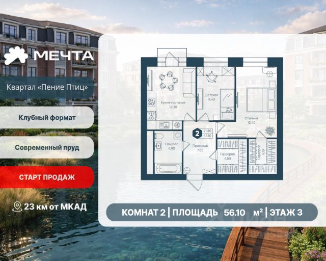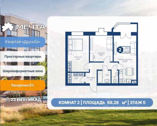 Рассрочка 0% от застройщика! Продается двухкомнатная квартира в квартале "Любовь" жилого комплекса "Мечта". Общая площадь квартиры: 66.38 кв. м, этаж 5 из 5. Срок сдачи: 4 квартал 2027 г. Отделка: Чернова ОСОБЕННОСТИ: - Просторная кухня-гостиная - Продуманная планировка - 2 спальни - 2 санузла - Гардеробная - Балкон - Высота потолка: 2.7 метра Квартал "Любовь" — это пять пятиэтажных домов, где продумано действительно всё. Здесь каждая квартира получает больше воздуха и света благодаря панорамным окнам и эркерам. А лифты в малоэтажном доме — большая редкость для Подмосковья, которая делает жизнь комфортнее с первого и до последнего этажа. Просторные мастер-спальни и продуманные планировки — визитная карточка квартала. А из 80% квартир открываются отличные виды: на зелёную зону, центральный парк, природный заказник или реликтовое озеро. В вашем дворе будет собственный детский сад, а в шаговой доступности — образовательный кампус, лес и Парк Мечты. Всё рядом, всё для жизни. Жилой комплекс "Мечта" расположен в 23 км от МКАД по Дмитровскому или Ленинградскому шоссе. ТРАНСПОРТНАЯ ДОСТУПНОСТЬ: - 15-20 минут на общественном транспорте до МЦД-1 "Лобня" - 30-35 минут на общественном транспорте до метро "Физтех" - 45-50 минут до станций метро "Савеловская" или "Белорусская" - 30 минут на автомобиле до Москвы Инфраструктура включает в себя муниципальную школу и детские сады, кабинет врача общей практики, множество кафе и ресторанов, а также различные спортивные и детские площадки. В пешей доступности от жилого комплекса расположены лес и три реликтовых озера — Долгое, Круглое и Нерское, а также реки Альба, Уча и Волгуша. Территория жилого комплекса закрыта для посторонних, находится под охраной и патрулируется. На въезде расположен КПП. Камеры видеонаблюдения работают круглосуточно на всей территории. Вы и ваши дети будете чувствовать себя в безопасности.