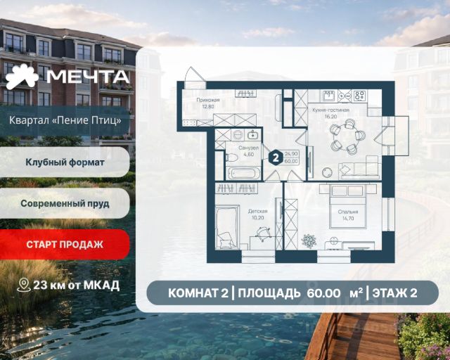 Рассрочка 0% от застройщика! Продается двухкомнатная квартира в квартале "Любовь" жилого комплекса "Мечта". Общая площадь квартиры: 66.38 кв. м, этаж 5 из 5. Срок сдачи: 4 квартал 2027 г. Отделка: Чернова ОСОБЕННОСТИ: - Просторная кухня-гостиная - Продуманная планировка - 2 спальни - 2 санузла - Гардеробная - Балкон - Высота потолка: 2.7 метра Квартал "Любовь" — это пять пятиэтажных домов, где продумано действительно всё. Здесь каждая квартира получает больше воздуха и света благодаря панорамным окнам и эркерам. А лифты в малоэтажном доме — большая редкость для Подмосковья, которая делает жизнь комфортнее с первого и до последнего этажа. Просторные мастер-спальни и продуманные планировки — визитная карточка квартала. А из 80% квартир открываются отличные виды: на зелёную зону, центральный парк, природный заказник или реликтовое озеро. В вашем дворе будет собственный детский сад, а в шаговой доступности — образовательный кампус, лес и Парк Мечты. Всё рядом, всё для жизни. Жилой комплекс "Мечта" расположен в 23 км от МКАД по Дмитровскому или Ленинградскому шоссе. ТРАНСПОРТНАЯ ДОСТУПНОСТЬ: - 15-20 минут на общественном транспорте до МЦД-1 "Лобня" - 30-35 минут на общественном транспорте до метро "Физтех" - 45-50 минут до станций метро "Савеловская" или "Белорусская" - 30 минут на автомобиле до Москвы Инфраструктура включает в себя муниципальную школу и детские сады, кабинет врача общей практики, множество кафе и ресторанов, а также различные спортивные и детские площадки. В пешей доступности от жилого комплекса расположены лес и три реликтовых озера — Долгое, Круглое и Нерское, а также реки Альба, Уча и Волгуша. Территория жилого комплекса закрыта для посторонних, находится под охраной и патрулируется. На въезде расположен КПП. Камеры видеонаблюдения работают круглосуточно на всей территории. Вы и ваши дети будете чувствовать себя в безопасности.