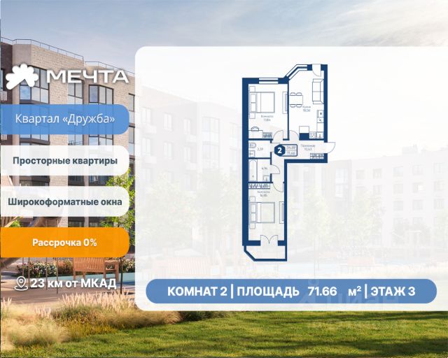 Рассрочка 0% от застройщика! Продается трехкомнатная квартира в квартале "Любовь" жилого комплекса "Мечта". Общая площадь квартиры: 92.69 кв. м, этаж 3 из 5. Срок сдачи: 4 квартал 2027 г. Отделка: Получистовая ОСОБЕННОСТИ: - Просторная кухня-гостиная - Продуманная планировка - 3 спальни - 2 санузла - Высота потолка: 2.7 метра Квартал "Любовь" — это пять пятиэтажных домов, где продумано действительно всё. Здесь каждая квартира получает больше воздуха и света благодаря панорамным окнам и эркерам. А лифты в малоэтажном доме — большая редкость для Подмосковья, которая делает жизнь комфортнее с первого и до последнего этажа. Просторные мастер-спальни и продуманные планировки — визитная карточка квартала. А из 80% квартир открываются отличные виды: на зелёную зону, центральный парк, природный заказник или реликтовое озеро. В вашем дворе будет собственный детский сад, а в шаговой доступности — образовательный кампус, лес и Парк Мечты. Всё рядом, всё для жизни. Жилой комплекс "Мечта" расположен в 23 км от МКАД по Дмитровскому или Ленинградскому шоссе. ТРАНСПОРТНАЯ ДОСТУПНОСТЬ: - 15-20 минут на общественном транспорте до МЦД-1 "Лобня" - 30-35 минут на общественном транспорте до метро "Физтех" - 45-50 минут до станций метро "Савеловская" или "Белорусская" - 30 минут на автомобиле до Москвы Инфраструктура включает в себя муниципальную школу и детские сады, кабинет врача общей практики, множество кафе и ресторанов, а также различные спортивные и детские площадки. В пешей доступности от жилого комплекса расположены лес и три реликтовых озера — Долгое, Круглое и Нерское, а также реки Альба, Уча и Волгуша. Территория жилого комплекса закрыта для посторонних, находится под охраной и патрулируется. На въезде расположен КПП. Камеры видеонаблюдения работают круглосуточно на всей территории. Вы и ваши дети будете чувствовать себя в безопасности.