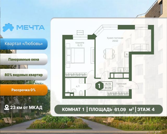 Рассрочка 0% от застройщика! Продается двухкомнатная квартира в квартале "Дружба" жилого комплекса "Мечта". Общая площадь квартиры: 59.54 кв. м, этаж 5 из 5. Срок сдачи: 4 квартал 2027 г. Отделка: Чернова ОСОБЕННОСТИ: - Просторная кухня-гостиная - Продуманная планировка - Широкоформатные окна - 2 спальни - 2 санузла - Высота потолка: 2.7 метра Квартал "Дружба" состоит из пяти пятиэтажных домов с несколькими подъездами. Каждый дом оборудован широкими окнами, которые обеспечивают максимальный доступ естественного света и открывают прекрасный вид на окружающую природу. Квартал отличается большими застеклёнными лоджиями, которые позволяют наслаждаться свежим воздухом и красивым видом, не покидая своего жилища. Жилой комплекс "Мечта" расположен в 23 км от МКАД по Дмитровскому или Ленинградскому шоссе. ТРАНСПОРТНАЯ ДОСТУПНОСТЬ: - 15-20 минут на общественном транспорте до МЦД-1 "Лобня" - 30-35 минут на общественном транспорте до метро "Физтех" - 45-50 минут до станций метро "Савеловская" или "Белорусская" - 30 минут на автомобиле до Москвы Инфраструктура включает в себя муниципальную школу и детские сады, кабинет врача общей практики, множество кафе и ресторанов, а также различные спортивные и детские площадки. В пешей доступности от жилого комплекса расположены лес и три реликтовых озера — Долгое, Круглое и Нерское, а также реки Альба, Уча и Волгуша. Территория жилого комплекса закрыта для посторонних, находится под охраной и патрулируется. На въезде расположен КПП. Камеры видеонаблюдения работают круглосуточно на всей территории. Вы и ваши дети будете чувствовать себя в безопасности.