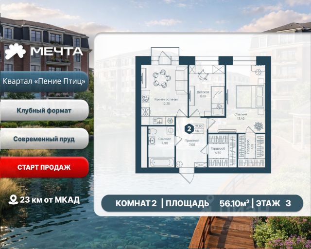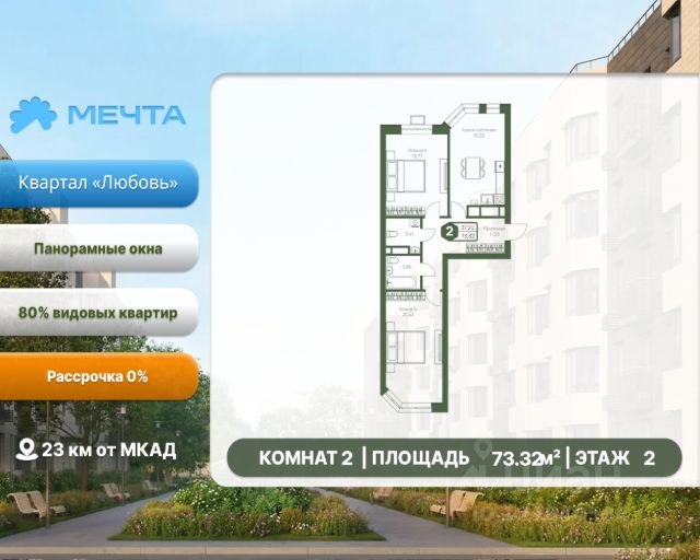 Рассрочка 0% от застройщика! Продается двухкомнатная квартира в квартале "Дружба" жилого комплекса "Мечта". Общая площадь квартиры: 59.54 кв. м, этаж 5 из 5. Срок сдачи: 4 квартал 2027 г. Отделка: Чернова ОСОБЕННОСТИ: - Просторная кухня-гостиная - Продуманная планировка - Широкоформатные окна - 2 спальни - 2 санузла - Высота потолка: 2.7 метра Квартал "Дружба" состоит из пяти пятиэтажных домов с несколькими подъездами. Каждый дом оборудован широкими окнами, которые обеспечивают максимальный доступ естественного света и открывают прекрасный вид на окружающую природу. Квартал отличается большими застеклёнными лоджиями, которые позволяют наслаждаться свежим воздухом и красивым видом, не покидая своего жилища. Жилой комплекс "Мечта" расположен в 23 км от МКАД по Дмитровскому или Ленинградскому шоссе. ТРАНСПОРТНАЯ ДОСТУПНОСТЬ: - 15-20 минут на общественном транспорте до МЦД-1 "Лобня" - 30-35 минут на общественном транспорте до метро "Физтех" - 45-50 минут до станций метро "Савеловская" или "Белорусская" - 30 минут на автомобиле до Москвы Инфраструктура включает в себя муниципальную школу и детские сады, кабинет врача общей практики, множество кафе и ресторанов, а также различные спортивные и детские площадки. В пешей доступности от жилого комплекса расположены лес и три реликтовых озера — Долгое, Круглое и Нерское, а также реки Альба, Уча и Волгуша. Территория жилого комплекса закрыта для посторонних, находится под охраной и патрулируется. На въезде расположен КПП. Камеры видеонаблюдения работают круглосуточно на всей территории. Вы и ваши дети будете чувствовать себя в безопасности.