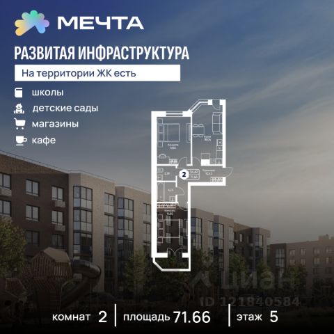 Рассрочка 0% от застройщика! Продается однокомнатная квартира в квартале "Любовь" жилого комплекса "Мечта". Общая площадь квартиры: 37.09 кв. м, этаж 2 из 5. Заселение: 2 квартал 2028 г. Отделка: Чистовая ОСОБЕННОСТИ: - Просторная спальня - Гардеробная - Балкон - Высота потолка: 2.7 метра Жилой комплекс "Мечта" расположен в 23 км от МКАД по Дмитровскому или Ленинградскому шоссе. ТРАНСПОРТНАЯ ДОСТУПНОСТЬ: - 15-20 минут на общественном транспорте до МЦД-1 "Лобня" - 30-35 минут на общественном транспорте до метро "Физтех" - 45-50 минут до станций метро "Савеловская" или "Белорусская" - 30 минут на автомобиле до Москвы Квартал "Любовь" создан для тех, кому стало тесно в рамках стандартного жилья. Здесь учтены все запросы к современному комфорту: продуманные планировки, балконы, эркеры и лифты в малоэтажных домах. Инфраструктура включает в себя муниципальную школу и детские сады, кабинет врача общей практики, множество кафе и ресторанов, а также различные спортивные и детские площадки. В пешей доступности от жилого комплекса расположены лес и три реликтовых озера — Долгое, Круглое и Нерское, а также реки Альба, Уча и Волгуша. Территория жилого комплекса закрыта для посторонних, находится под охраной и патрулируется. На въезде расположен КПП. Камеры видеонаблюдения работают круглосуточно на всей территории. Вы и ваши дети будете чувствовать себя в безопасности.