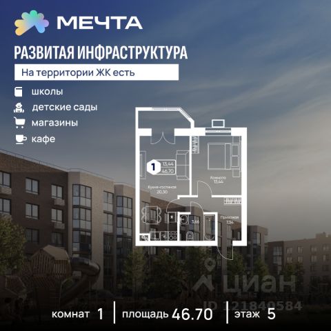 Рассрочка 0% от застройщика! Продается однокомнатная квартира в квартале "Любовь" жилого комплекса "Мечта". Общая площадь квартиры: 37.09 кв. м, этаж 2 из 5. Заселение: 2 квартал 2028 г. Отделка: Чистовая ОСОБЕННОСТИ: - Просторная спальня - Гардеробная - Балкон - Высота потолка: 2.7 метра Жилой комплекс "Мечта" расположен в 23 км от МКАД по Дмитровскому или Ленинградскому шоссе. ТРАНСПОРТНАЯ ДОСТУПНОСТЬ: - 15-20 минут на общественном транспорте до МЦД-1 "Лобня" - 30-35 минут на общественном транспорте до метро "Физтех" - 45-50 минут до станций метро "Савеловская" или "Белорусская" - 30 минут на автомобиле до Москвы Квартал "Любовь" создан для тех, кому стало тесно в рамках стандартного жилья. Здесь учтены все запросы к современному комфорту: продуманные планировки, балконы, эркеры и лифты в малоэтажных домах. Инфраструктура включает в себя муниципальную школу и детские сады, кабинет врача общей практики, множество кафе и ресторанов, а также различные спортивные и детские площадки. В пешей доступности от жилого комплекса расположены лес и три реликтовых озера — Долгое, Круглое и Нерское, а также реки Альба, Уча и Волгуша. Территория жилого комплекса закрыта для посторонних, находится под охраной и патрулируется. На въезде расположен КПП. Камеры видеонаблюдения работают круглосуточно на всей территории. Вы и ваши дети будете чувствовать себя в безопасности.