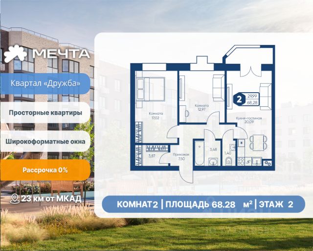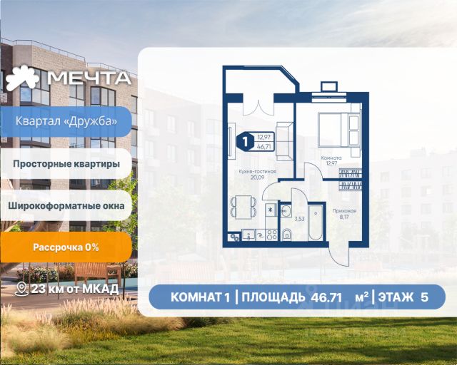 Рассрочка 0% от застройщика! Продается однокомнатная квартира в квартале "Любовь" жилого комплекса "Мечта". Общая площадь квартиры: 37.09 кв. м, этаж 2 из 5. Срок сдачи: 4 квартал 2027 г. Отделка: Чистовая ОСОБЕННОСТИ: - Просторная спальня - Гардеробная - Балкон - Высота потолка: 2.7 метра Квартал "Любовь" — это пять пятиэтажных домов, где продумано действительно всё. Здесь каждая квартира получает больше воздуха и света благодаря панорамным окнам и эркерам. А лифты в малоэтажном доме — большая редкость для Подмосковья, которая делает жизнь комфортнее с первого и до последнего этажа. Просторные мастер-спальни и продуманные планировки — визитная карточка квартала. А из 80% квартир открываются отличные виды: на зелёную зону, центральный парк, природный заказник или реликтовое озеро. В вашем дворе будет собственный детский сад, а в шаговой доступности — образовательный кампус, лес и Парк Мечты. Всё рядом, всё для жизни. Жилой комплекс "Мечта" расположен в 23 км от МКАД по Дмитровскому или Ленинградскому шоссе. ТРАНСПОРТНАЯ ДОСТУПНОСТЬ: - 15-20 минут на общественном транспорте до МЦД-1 "Лобня" - 30-35 минут на общественном транспорте до метро "Физтех" - 45-50 минут до станций метро "Савеловская" или "Белорусская" - 30 минут на автомобиле до Москвы Инфраструктура включает в себя муниципальную школу и детские сады, кабинет врача общей практики, множество кафе и ресторанов, а также различные спортивные и детские площадки. В пешей доступности от жилого комплекса расположены лес и три реликтовых озера — Долгое, Круглое и Нерское, а также реки Альба, Уча и Волгуша. Территория жилого комплекса закрыта для посторонних, находится под охраной и патрулируется. На въезде расположен КПП. Камеры видеонаблюдения работают круглосуточно на всей территории. Вы и ваши дети будете чувствовать себя в безопасности.