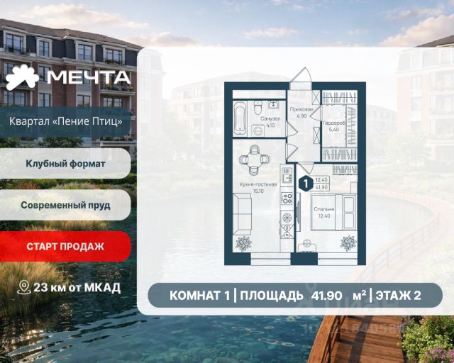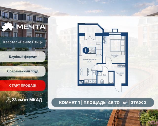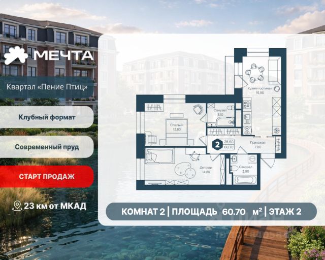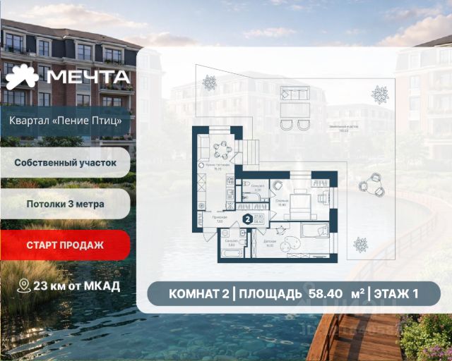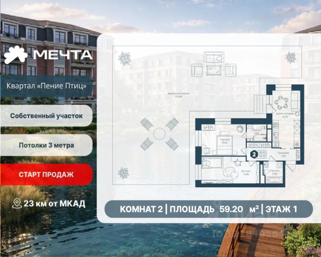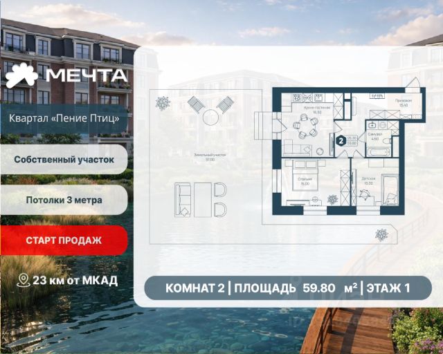 СТАРТ ПРОДАЖ! Рассрочка 0% от застройщика! Продается двухкомнатная квартира в квартале "Пение птиц" жилого комплекса "Мечта". Общая площадь квартиры: 54.60 кв. м, этаж 1 из 3. Срок сдачи: 4 квартал 2027 г. Отделка: Получистовая Квартал "Пение птиц" — это малоэтажный формат жизни у самого леса. Дома в 3 и 5 этажей с классическими фасадами и французскими балкончиками создают камерную атмосферу и ощущение загородного уюта. В пятиэтажных корпусах предусмотрены лифты. А прямо за окнами — природный заказник, так что лес становится естественным продолжением вашего дома. В квартале представлены квартиры с собственными земельными участками (до 3 соток) — редкий для малоэтажного формата вариант, позволяющий иметь личное пространство на природе. В самих квартирах продумано всё для простора и света: высота потолков 3 метра, панорамные окна и эркеры. Сердце квартала — современный пруд с собственной экосистемой. Летом здесь фонтан, мостики и шезлонги, а зимой пруд превращается в атмосферный каток. Это место для прогулок и отдыха, не выходя из района. Входные группы продуманы до мелочей: просторные холлы, колясочные, лапомойки. Всё создано для спокойной, комфортной и красивой жизни. Жилой комплекс "Мечта" расположен в 23 км от МКАД по Дмитровскому или Ленинградскому шоссе. ТРАНСПОРТНАЯ ДОСТУПНОСТЬ: - 15-20 минут на общественном транспорте до МЦД-1 "Лобня" - 30-35 минут на общественном транспорте до метро "Физтех" - 45-50 минут до станций метро "Савеловская" или "Белорусская" - 30 минут на автомобиле до Москвы Инфраструктура включает в себя муниципальную школу и детские сады, кабинет врача общей практики, множество кафе и ресторанов, а также различные спортивные и детские площадки. В пешей доступности от жилого комплекса расположены лес и три реликтовых озера — Долгое, Круглое и Нерское, а также реки Альба, Уча и Волгуша. Территория жилого комплекса закрыта для посторонних, находится под охраной и патрулируется. На въезде расположен КПП. Камеры видеонаблюдения работают круглосуточно на всей территории. Вы и ваши дети будете чувствовать себя в безопасности.