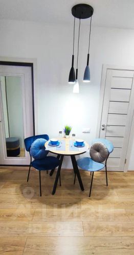 Роскошная обеденная зона с синими велюровыми стульями располагает к неспешному общению в компании любимого человека.