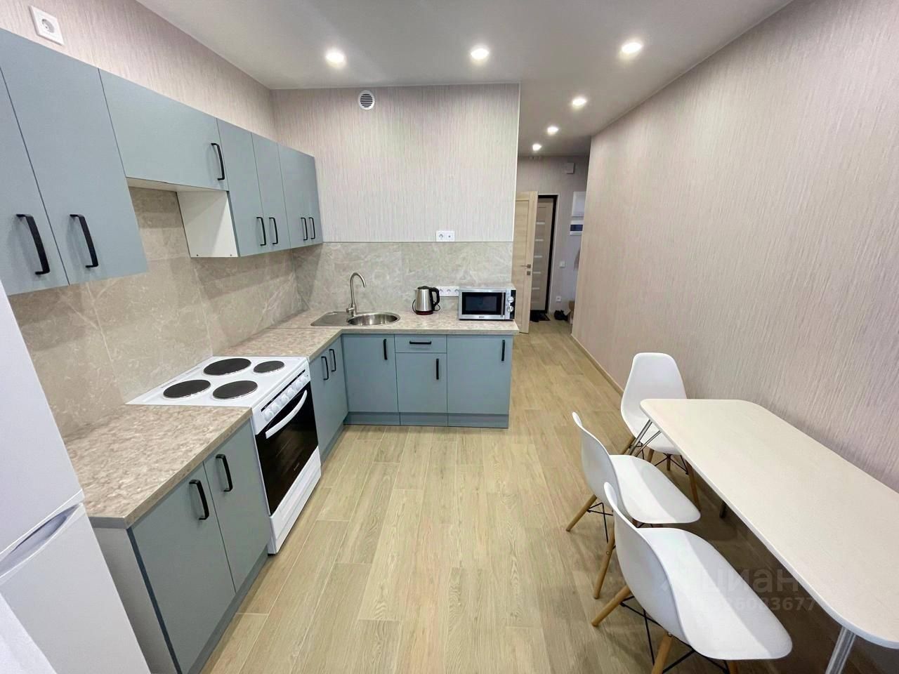 Общая площадь 60 кв. м., кухня 10,1 кв. м., комнаты 17 и 13 кв. м, санузел раздельный. Также есть отдельная гардеробная.