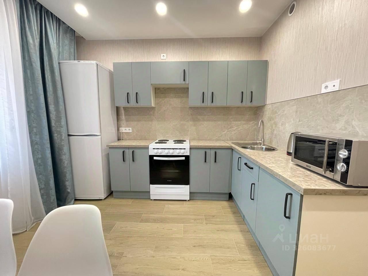 Квартира оборудована всем необходимым для проживания: на кухне есть холодильник, кухонный гарнитур с плитой, электрический чайник и микроволновка. В одной комнате есть шкаф и двуспальная кровать, в другой - раскладной диван и телевизор. В ванной комнате остается стиральная машинка.