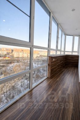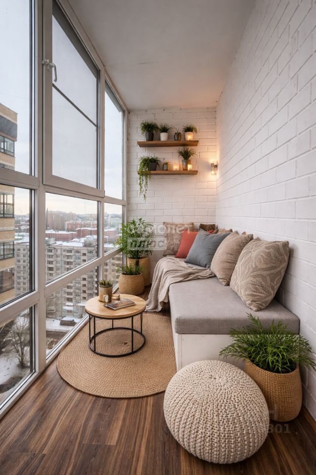 Уютная лоджия с панорамным остеклением и потрясающим видом на город.