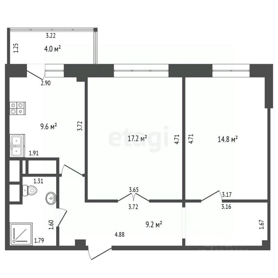Квартира расположена на 4 этаже 13-ти этажного дома. Общая площадь 60.3 кв.м. Современный ремонт. Планировка: кухня-гостиная 9.6 кв.м и 17.2 кв.м, спальная комната - 14.8 кв.м, совмещенный санузел, просторная лоджия.