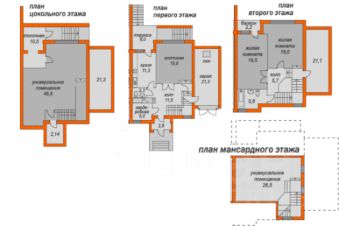 • 4 уровня: цокольный этаж, два жилых этажа и мансарда