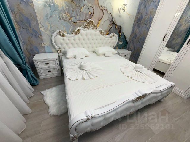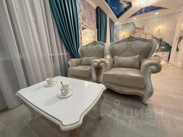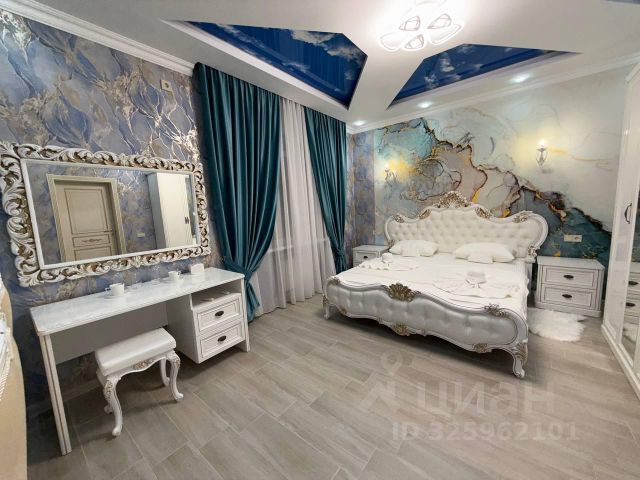 Дополнительные детали: стены украшены эффектными мраморными обоями в сине-золотых тонах, создающими атмосферу роскоши; изысканные шторы насыщенного бирюзового цвета гармонично сочетаются с общим дизайном;